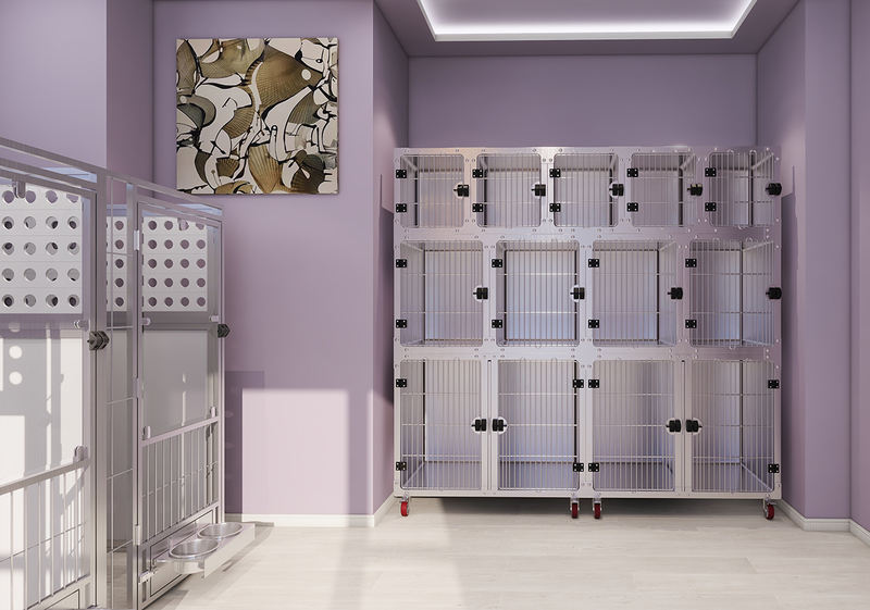 Multi-propositum Animal Conscendens et Cavea Quarantina robusta, temperata vitreis tuta sunt ut vitam eximie longam servitutem curent dum omnino impediunt ne animal exasperentur. Cavea principalis corporis lineamenta rotundata in angulis rotundis iuncta ad facilem purgationem et hygienam tuendam. Unitates cavea directe poni possunt ante fenestras existentes, eas maxime idoneas ad catellas venditionesque et adoptiones areas.